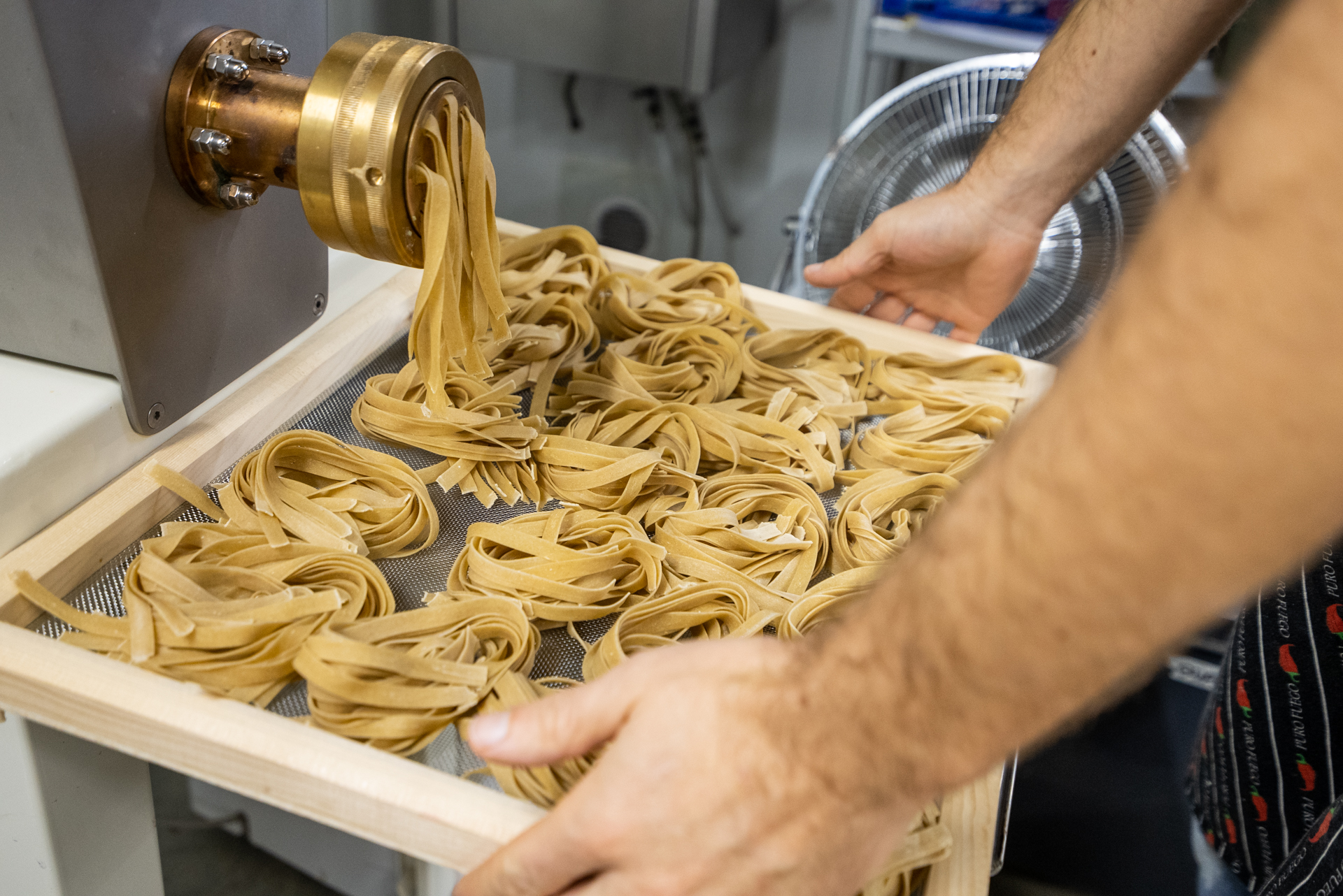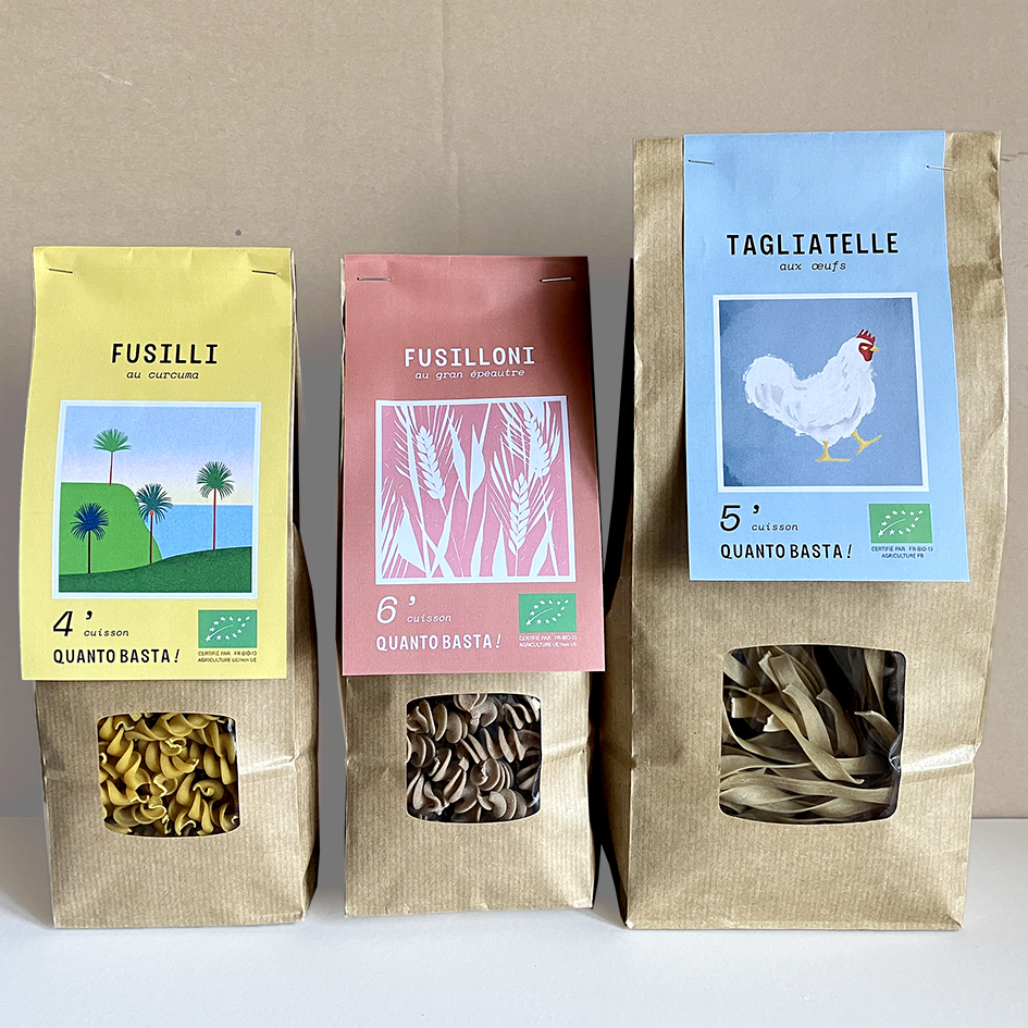 Quanto Basta, c’est l’histoire d’un couple d’Italiens Maddalena & Giacomo avec un rêve : celui de produire des pâtes de chez eux, avec des ingrédients cultivables sur leur terre d’adoption bretonne : ça tombe bien, petit, Giacomo se régalait de pizzoccheri, des pâtes au sarrasin, et Maddalena, de garganelli, des pâtes au blé tendre et aux œufs ! En attendant de pouvoir cultiver eux-mêmes leurs céréales localement, Giacomo et Madda sélectionnent avec attention des fournisseurs locaux – exception pour l’olio d’oliva ! – afin de transformer leurs produits bio et de saison en des plats et des pâtes qui revisitent la tradition culinaire italienne.